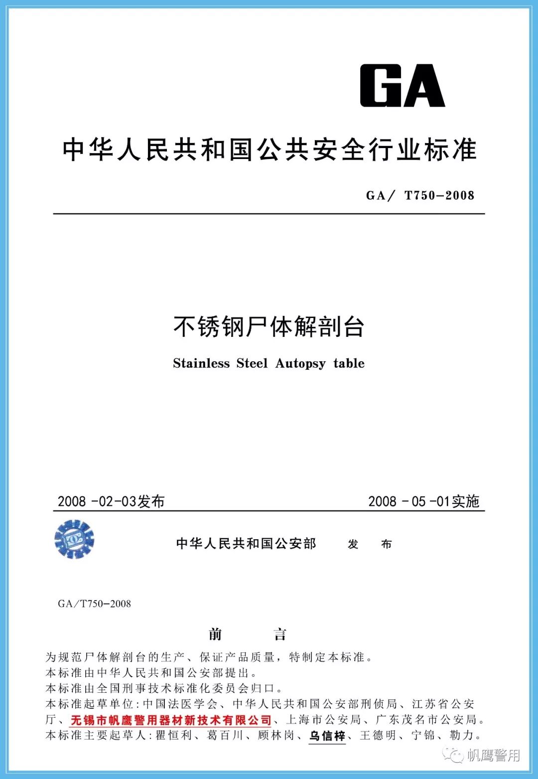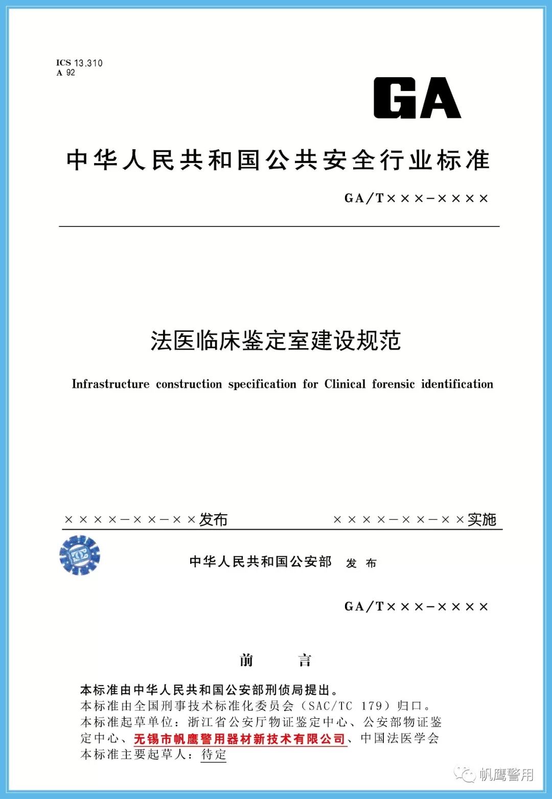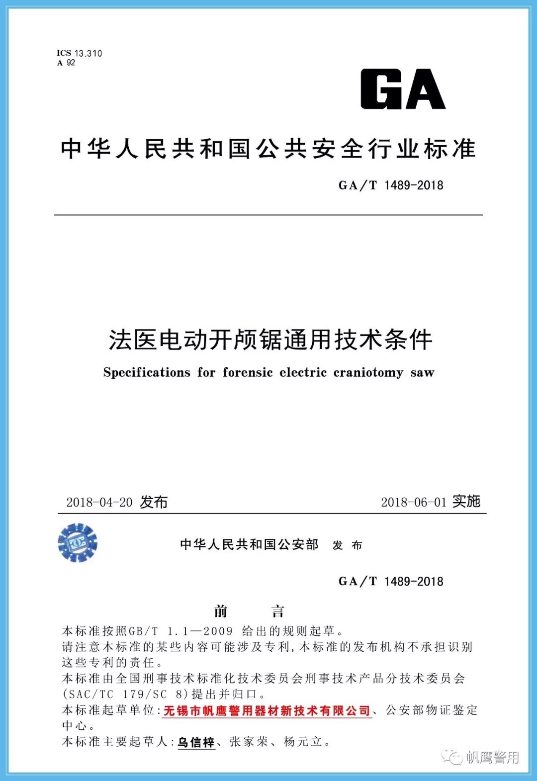 截止2019年,無錫帆鷹警用器材新技術有限公司先后共起草11項行業標準。標準含蓋解剖臺、熏顯柜、指紋捺印盒、槍彈射擊架、槍彈測速儀等硬件設備,也包含尸體解剖檢驗室、槍彈檢驗實驗室、法醫臨床鑒定室等工程建設。