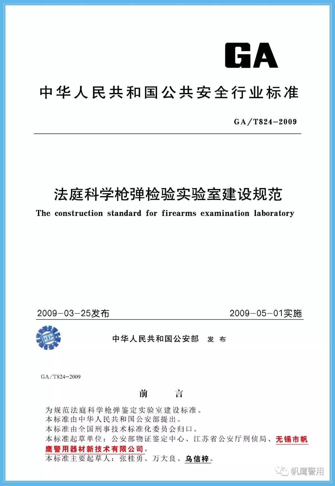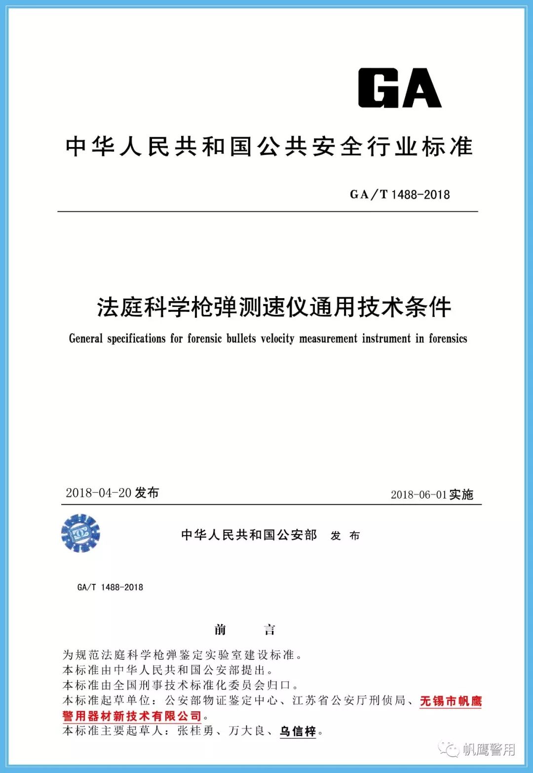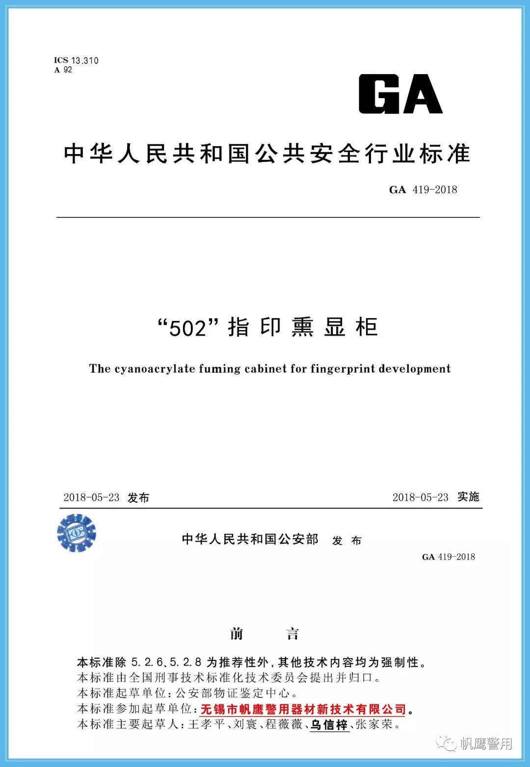 2018年,為了規范法庭科學槍彈鑒定實驗室建設標準,由公安部提出,并經全國刑事技術標準化委員會歸口,由無錫帆鷹警用器材新技術有限公司起草GA419-2018《“502”指印熏顯柜》、GA/T1488-2018《法庭科學槍彈測速儀通用技術條件》、GA/T1491-2018《法庭科學危險槍支射擊架通用技術條件》等三項中華人民共和國公共安全行業標準,分別在2018年5月份、6月份正式實施。
