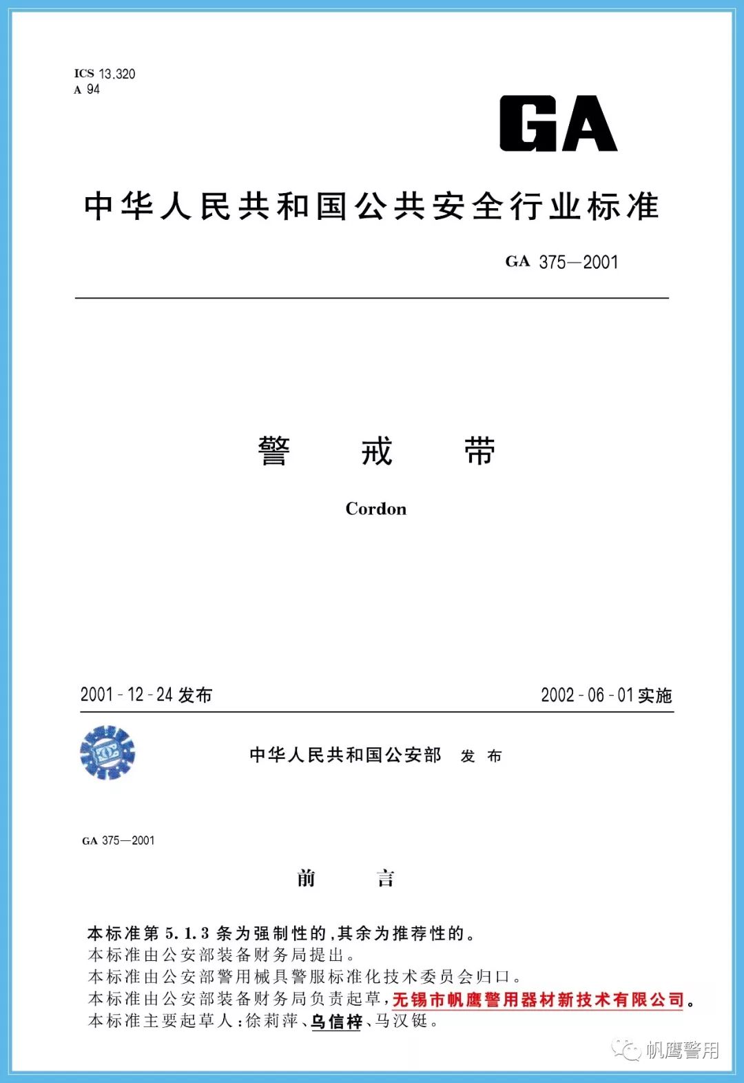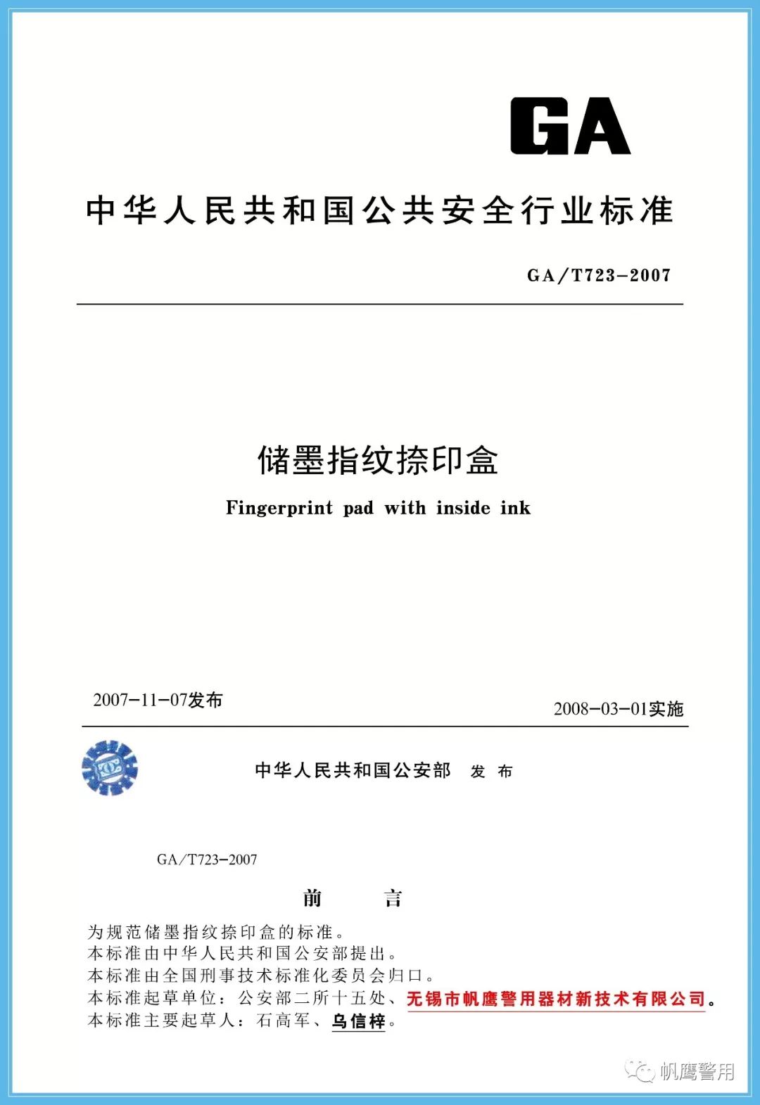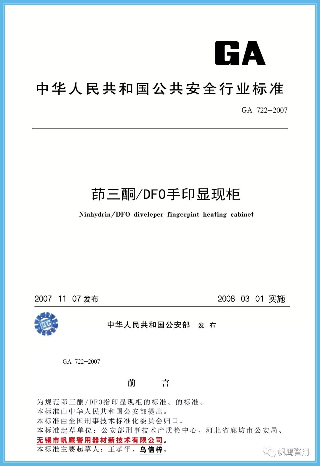 2018年,為了規范法庭科學槍彈鑒定實驗室建設標準,由公安部提出,并經全國刑事技術標準化委員會歸口,由無錫帆鷹警用器材新技術有限公司起草GA419-2018《“502”指印熏顯柜》、GA/T1488-2018《法庭科學槍彈測速儀通用技術條件》、GA/T1491-2018《法庭科學危險槍支射擊架通用技術條件》等三項中華人民共和國公共安全行業標準,分別在2018年5月份、6月份正式實施。